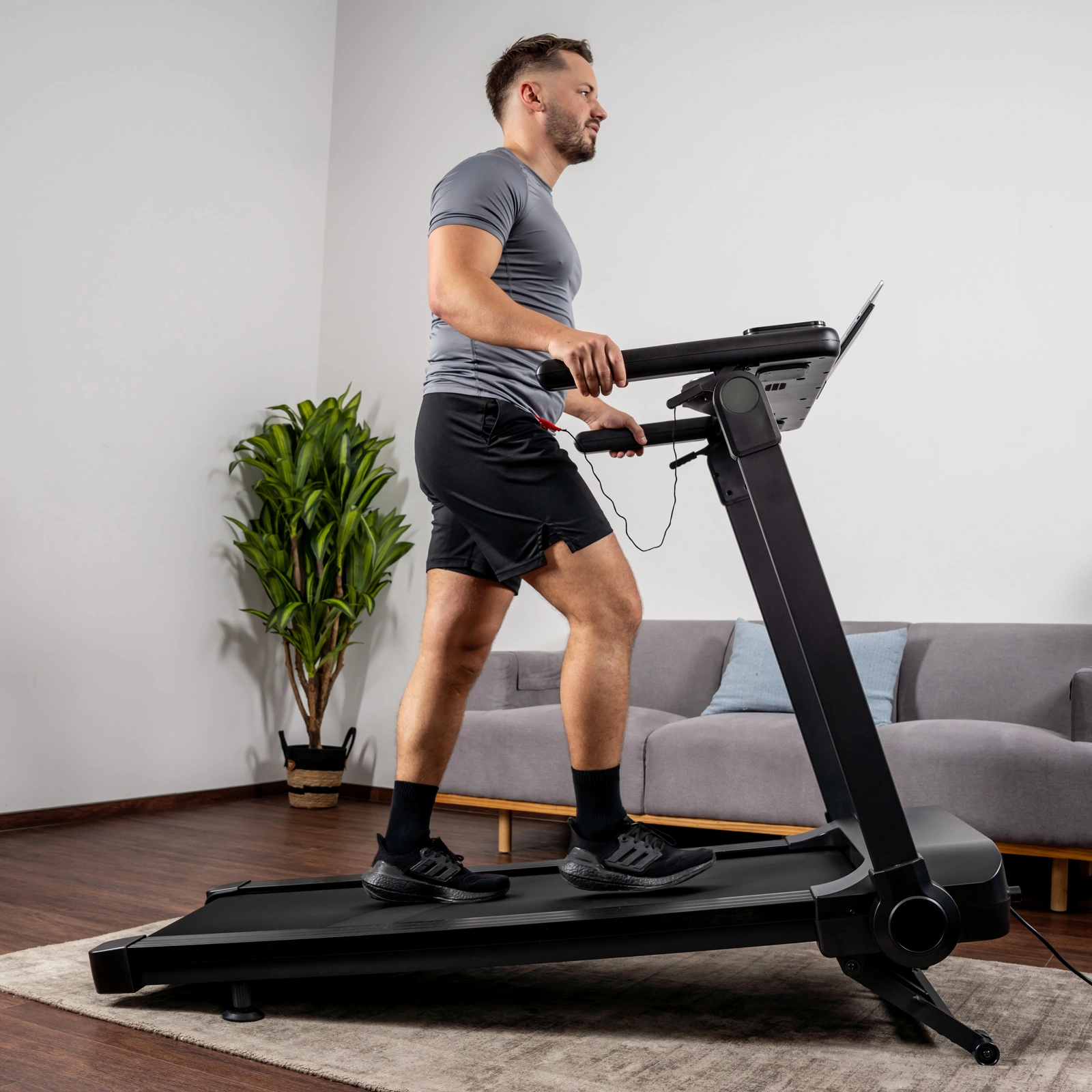 Skládací běžecký pás TRACK 200 je vybaven LCD displejem v konzoli, který zobrazuje všechny klíčové parametry: čas, vzdálenost, rychlost, sklon, spálené kalorie a tep. Díky tomu průběžně kontrolujete své pokroky a můžete snadno přizpůsobit intenzitu cvičení stanoveným cílům - od spalování tuků, přes zlepšení kondice, až po budování výdrže.Ovládání je jednoduché a intuitivní díky kolečku Jog Wheel a tlačítkům pro rychlý výběr rychlosti a sklonu. Běžecký pás je také kompatibilní s tréninkovými aplikacemi (např. Kinomap, ZWIFT, Fitshow) - ideální pro virtuální světy a interaktivní běhy (příp. další náklady).