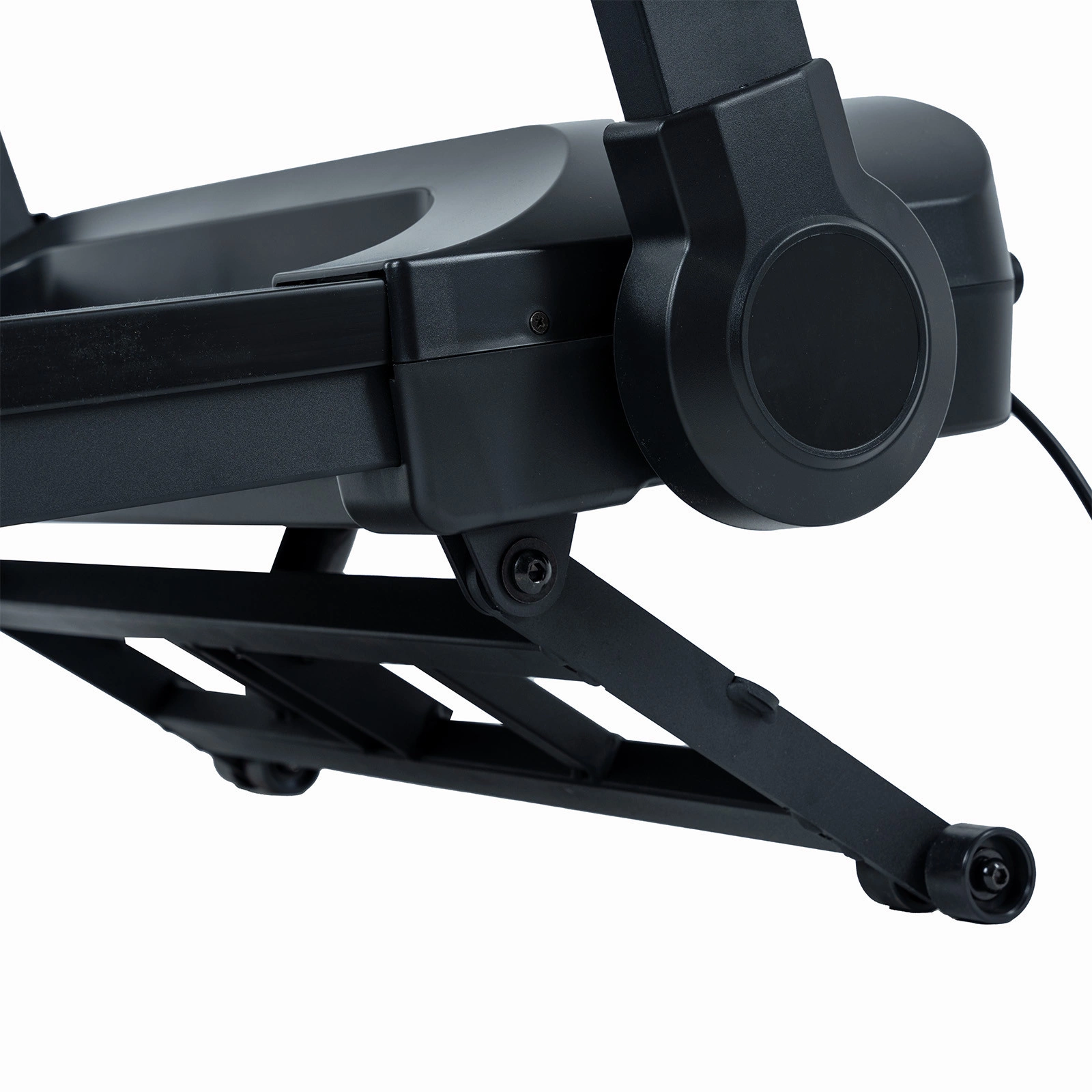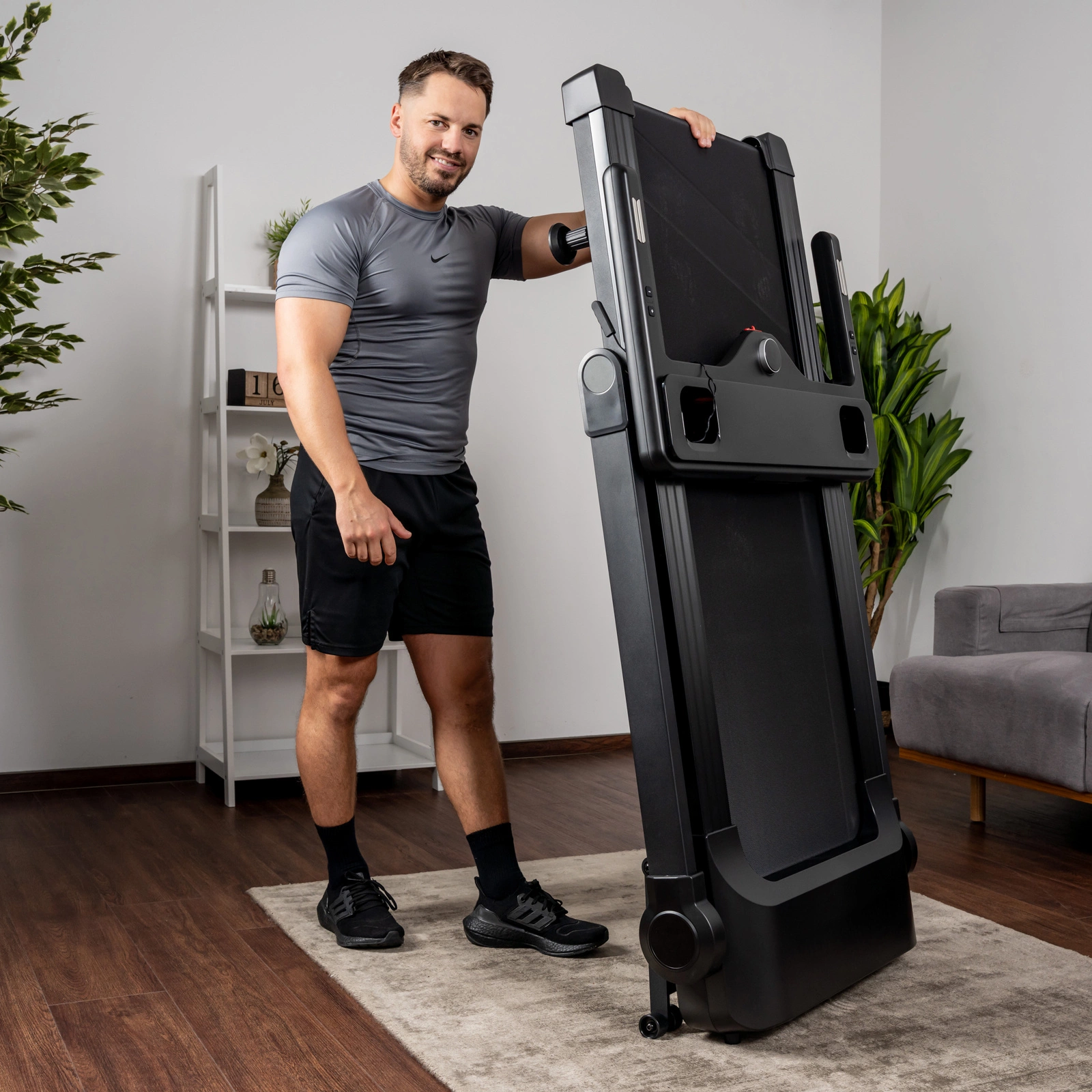 Elektrický běžecký pás TRACK 200 má funkci skládání, díky které po dokončeném tréninku snadno zmenšíte zabíraný prostor. V několika okamžicích zvedněte běžecký pás a transportní kolečka umožní přesunout zařízení na zvolené místo.Toto praktické řešení zajišťuje, že běžecký pás se skvěle hodí i do menších bytů, kde záleží na každém metru prostoru.